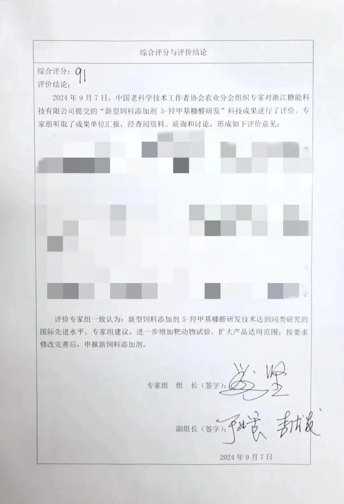 7 সেপ্টেম্বর, 2024-এ, Zhejiang Sugar Energy Co., Ltd. কর্তৃক জমা দেওয়া "5-hydroxymethylfurfural এর গবেষণা ও উন্নয়ন, একটি নতুন ফিড সংযোজন" এর বৈজ্ঞানিক ও প্রযুক্তিগত সাফল্য চীন অ্যাসোসিয়েশনের কৃষি শাখা দ্বারা আয়োজিত বিশেষজ্ঞ মূল্যায়নে উত্তীর্ণ হয়েছে। সিনিয়র বিজ্ঞানী এবং প্রযুক্তিবিদদের.